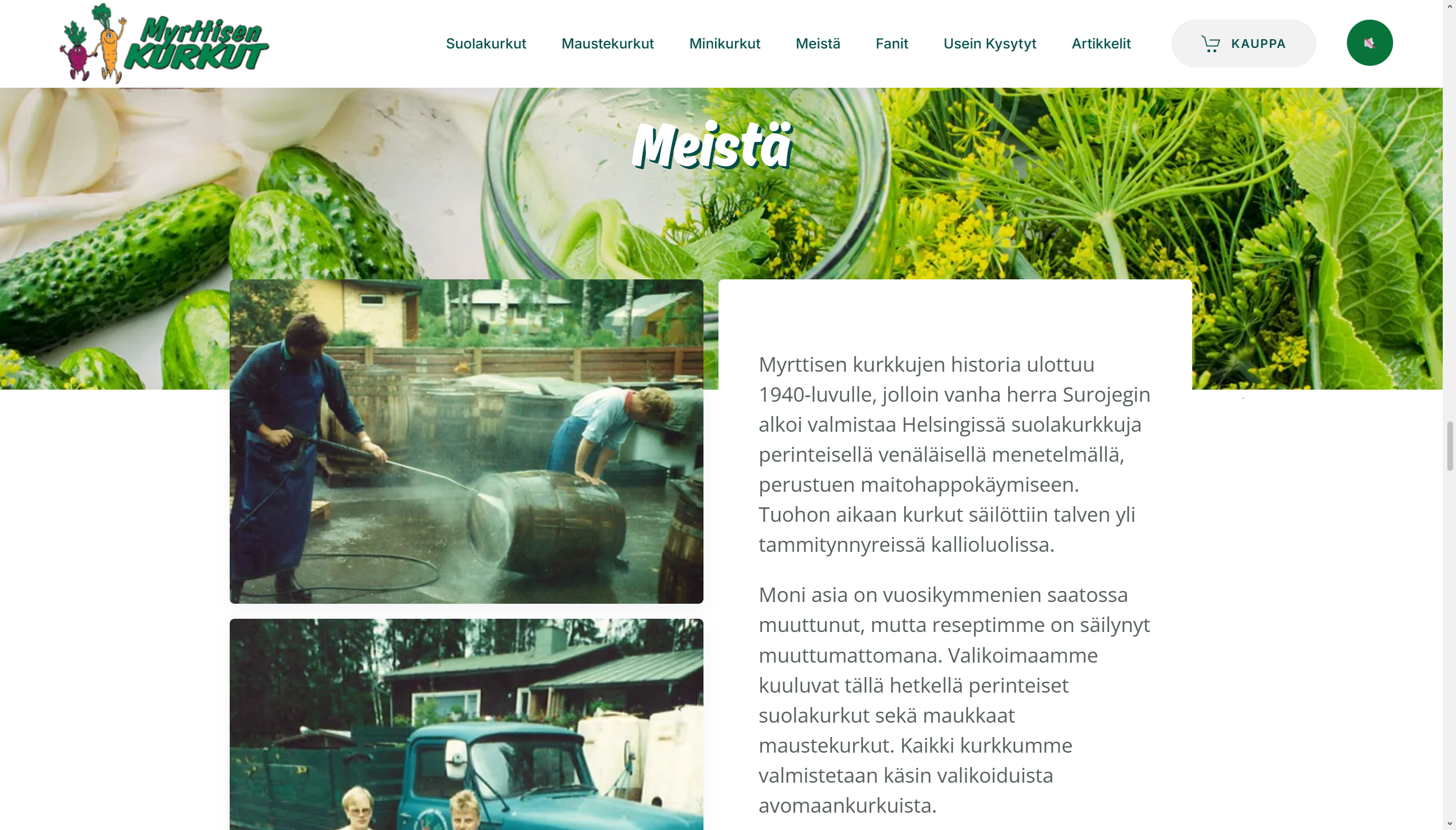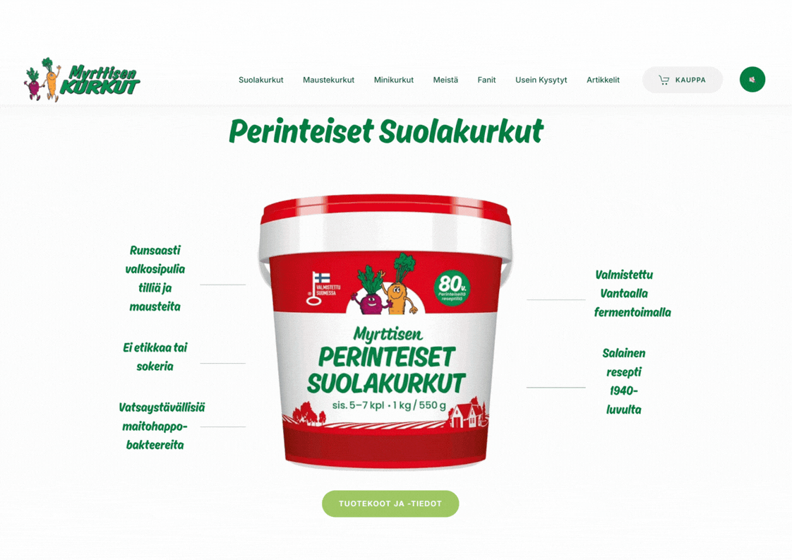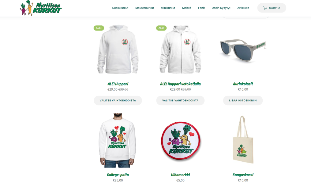 UUDLY teki uudet, freesit nettisivut meidän legendaarisille Myrttisen kurkuille, www.myrttisenkurkut.fi ja samalla rakensi uusiksi myös Myrttisen verkkokaupan. UUDLYn Johnin avulla sivujen suunnittelu ja toteutus kävi todella helposti ja nopeasti. Kommunikointi oli aina ystävällistä, vaikka näin asiakkaan suunnalta saattoikin tulla paljon tyhmiä kysymyksiä… 🙂 Sivut ovat tosi toimivat ja niitä on helppo ylläpitää nyt, kun ovat kunnossa. Suosittelemme UUDLYa lämpimästi!